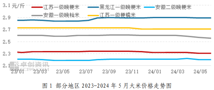 北方粳米价格涨跌互现,江苏粳米价格稳定。截至5月29日,黑龙江基层余粮下降,持货贸易主体低价惜售,部分产区米厂稻谷到厂价上涨,因成本增加,米价窄幅跟涨。圆粒米出厂主流价3660-3880元/吨,按质定价。同时由于下游优质长粒米需求平淡,米厂高价米走货不快,局部高端价格窄幅下调。黑龙江多数产区长粒香米出厂价4900-5100元/吨,少数产区出厂价4700-4800元/吨,按质定价。辽宁辽星米出厂主流价4200-4600元/吨,盐丰圆粒米出厂价3900-4040元/吨。江苏米厂稻谷到厂成本难降,加之下游客商抵触高价买米,米厂高价米难销,价格僵持运行。粳米出厂价3700-3900元/吨。