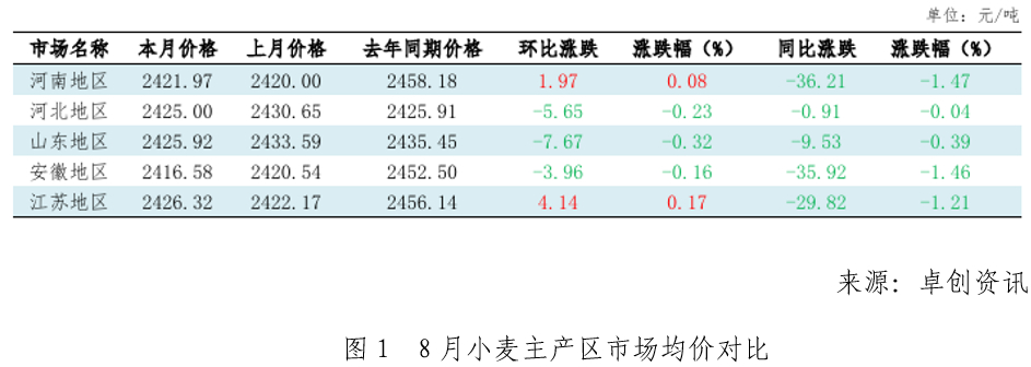 据卓创资讯统计,8月(截至27日)主产区小麦月均价2424.06元/吨,环比下跌1.88元/吨,跌幅0.08%,同比跌幅1.23%。
