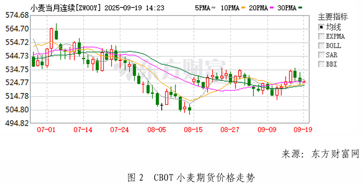 8月CBOT小麦主力期约价格先跌后涨。因北半球小麦主产国收获加速,全球小麦供应充裕且出口市场竞争激烈,美麦价格承压下跌,至阶段性低位后,有技术性空头回补操作,带动美麦价格小幅反弹。8月底CBOT小麦主力12月合约收于531.75美分/蒲式耳, 较7月28日下跌6.5美分/蒲式耳,跌幅1.21%。