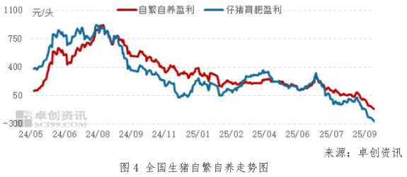 生猪养殖方面,9月份生猪自繁自养和仔猪育肥理论盈利呈震荡下滑走势。根据卓创资讯数据统计,截至9月底,生猪自繁自养理论盈利均值-17.64元/头,环比下滑127.69%,同比跌幅102.62%;1-9月均值为166.02元/头,同比下滑49.06%。本月仔猪育肥理论盈利均值-133.95元/头,环比跌372.49%,同比跌123.87%。1-9月均值为124.49元/头,同比下滑72.73%。