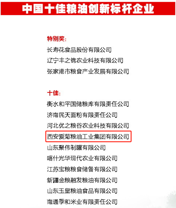 此外,西安爱菊粮油工业集团有限公司荣获“中国十佳粮油创新标杆企业”。陕西陕富面业有限责任公司荣获“粮安中国杰出贡献奖”“中国十佳粮油高质量发展典范企业”。