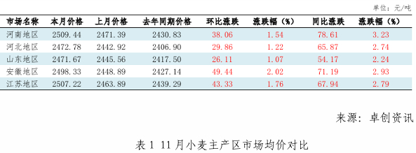 据卓创资讯统计,11月(截止到26日)主产区小麦月均价2489.85元/吨,环比上涨32.84元/吨,涨幅1.34%,同比上涨2.42%。