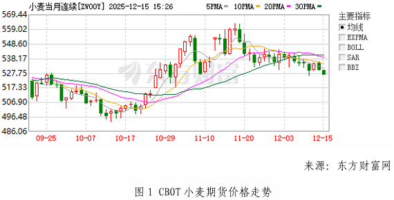 11月CBOT小麦主力期约价格呈现“M”型走势。上旬,在中国可能采购美国小麦的利好消息以及技术性买盘支撑下,美麦价格上涨,但因采购量低于预期,价格转而下跌,随后部分技术性逢低买盘带动美麦价格上涨,但因美国农业部供需数据偏空,全球小麦供应充足等利空影响,美麦价格再次震荡走低。11月底CBOT小麦主力3月合约收于538.5美分/蒲式耳,较10月28日上涨8.25美分/蒲式耳,涨幅1.56%。