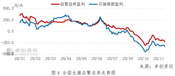 生猪养殖方面,11月生猪自繁自养和仔猪育肥理论盈利呈震荡下行走势。月内二次育肥补栏减少,散户加快出栏,叠加猪病和亏损推动大猪提前出栏,供应量整体略增;需求方面,由于气温回升,猪肉需求增量不及预期,供需双增影响下,生猪月均价环比持平。销售收入变动不大而养殖成本减少的情况下,自繁自养和仔猪育肥理论盈利月均值均环比略增。据卓创资讯数据统计,截至11月底,本月生猪自繁自养理论盈利均值-185.97元/头,环比上涨11.30%;本月仔猪育肥理论盈利均值-305.38元/头,环比上涨12.34%。