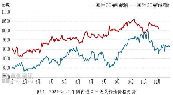 月中国内外市场利多因素较多,国际市场加拿大3.72亿加元生物燃料生产激励项目计划于2026年1月实施,菜籽油市场行情受此消息影响连续上涨。国内进口菜籽油库存量不断减少,支撑国内进口菜籽油行情上行。