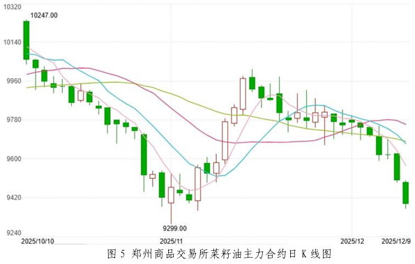 11月份郑州商品交易所菜籽油主力合约价格先涨后跌,整体价格小幅上涨。截至11月底,菜籽油2601合约价收于9757元/吨,较10月底上涨335元/吨,涨幅3.56%。