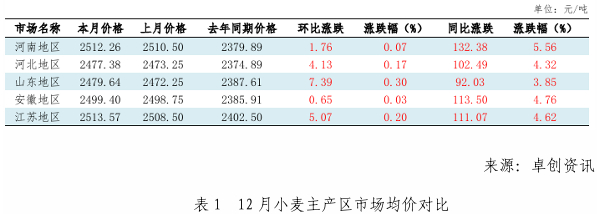 据卓创资讯统计,12月(截至29日)主产区小麦月均价2497.37元/吨,月环比上涨6.61元/吨,月环比涨幅0.27%,月同比涨幅4.43%。