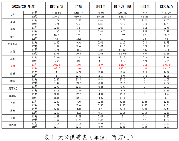 《美国农业部供需报告》12月预估2025/26年度全球稻米情况:供应量、贸易量、期末库存均增加,消费量下降。因期初库存增加部分超过产量减少部分,全球供应量增加170万吨,达到7.307亿吨。基于印度食品公司公布数据,印度期初库存大幅增加,带动全球期初库存上调。印度产量增加部分不足以抵消马达加斯加和菲律宾产量减少部分,全球大米产量下调50万吨,降至5.404亿吨。马达加斯加消费量下滑,全球大米消费量减少50万吨,降至5.419亿吨。由于缅甸及中国贸易量均有所上升,全球大米贸易量上调30万吨,达到6320万吨。因印度期末库存增加250万吨,全球大米期末库存量上调210万吨,达到1.888亿吨。