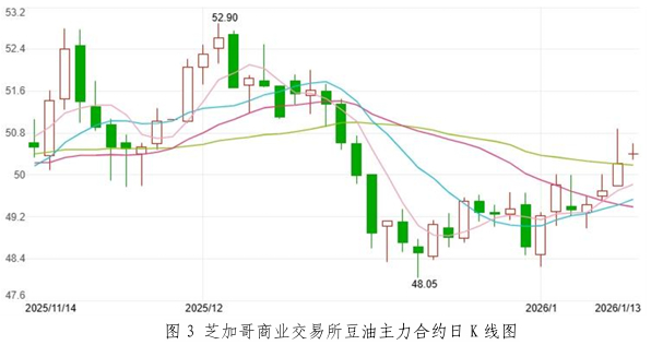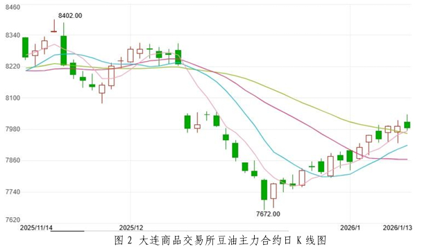 1月初国内豆油行情震荡上涨,现货均价环比小幅上涨。本月初国际市场南美局势紧张给予生物燃料价格提振,带动豆油市场行情走高。国内部分企业因原材料供应紧张停工,支撑国内豆油现货价格上涨。