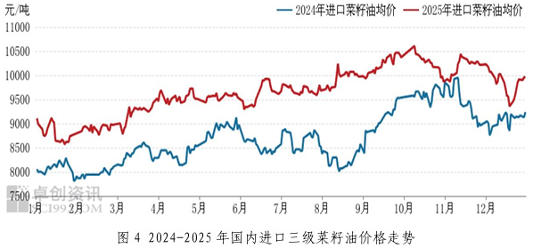 月末国际油脂油料价格下跌,国内菜籽油供应量有增加预期,叠加中国加拿大两国官员在渥太华共同主持中加第五轮领事磋商,贸易关系有向好预期,导致国内菜籽油价格下跌。但随后国际油脂油料价格上涨,叠加棕榈油市场行情强势,国内菜籽油行情上行。澳大利亚油菜籽压榨时间推迟,国内进口菜籽油供应继续减少,支撑国内进口菜籽油现货均价小幅上涨。